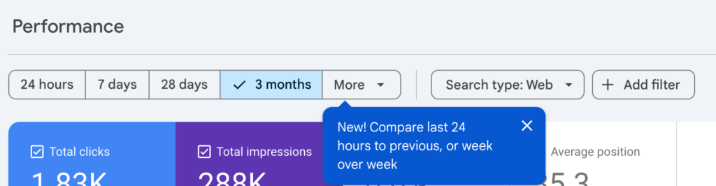 Google Search Console has introduced a new 24-hour view in its performance reports (see image below) along with fresher data updates. You can now compare day-over-day results for the past week, making it easier to spot and analyse real-time changes in your site’s search performance. This feature is rolling out gradually, so it may take a few months before everyone sees it. This gives you another way to view your performance data within Search Console, which can come in handy when trying to isolate and analyse more real-time issues and performance improvements.