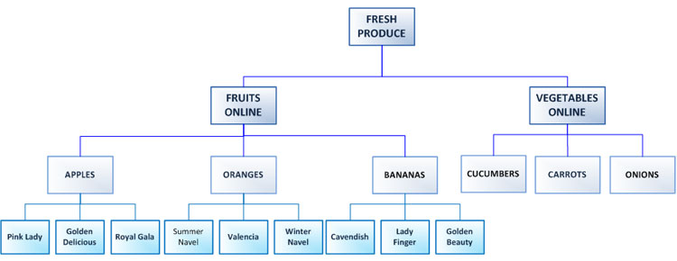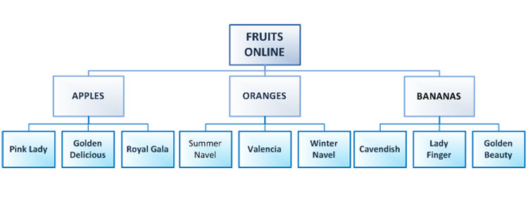 We will illustrate all of this using our virtual shop. Through our research, we have identified our site’s focus keyword as fruits online. This tells the users and search engines that we sell fruit online and that you can find fresh fruit on our site, delivered daily. Now it is time to create a structure based on relevant categories. In our example, we will just use a few different fruit types to illustrate the scenario. Once we’ve properly identified our target audience and keywords, we can then begin mapping out our categories and sub categories. Our new site structure should look something like this:
